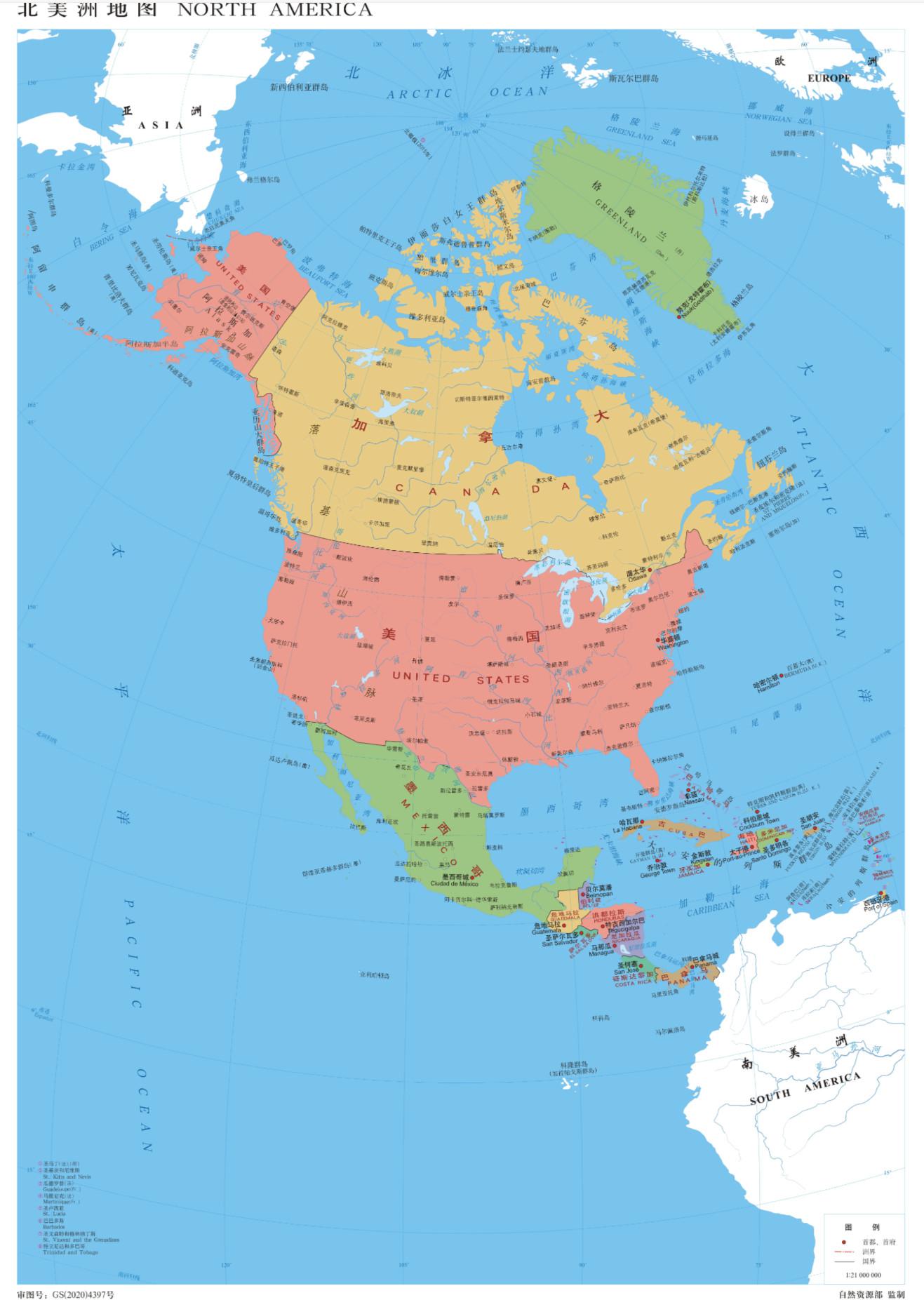 北美洲地图 1:2100万 4开 分国设色
