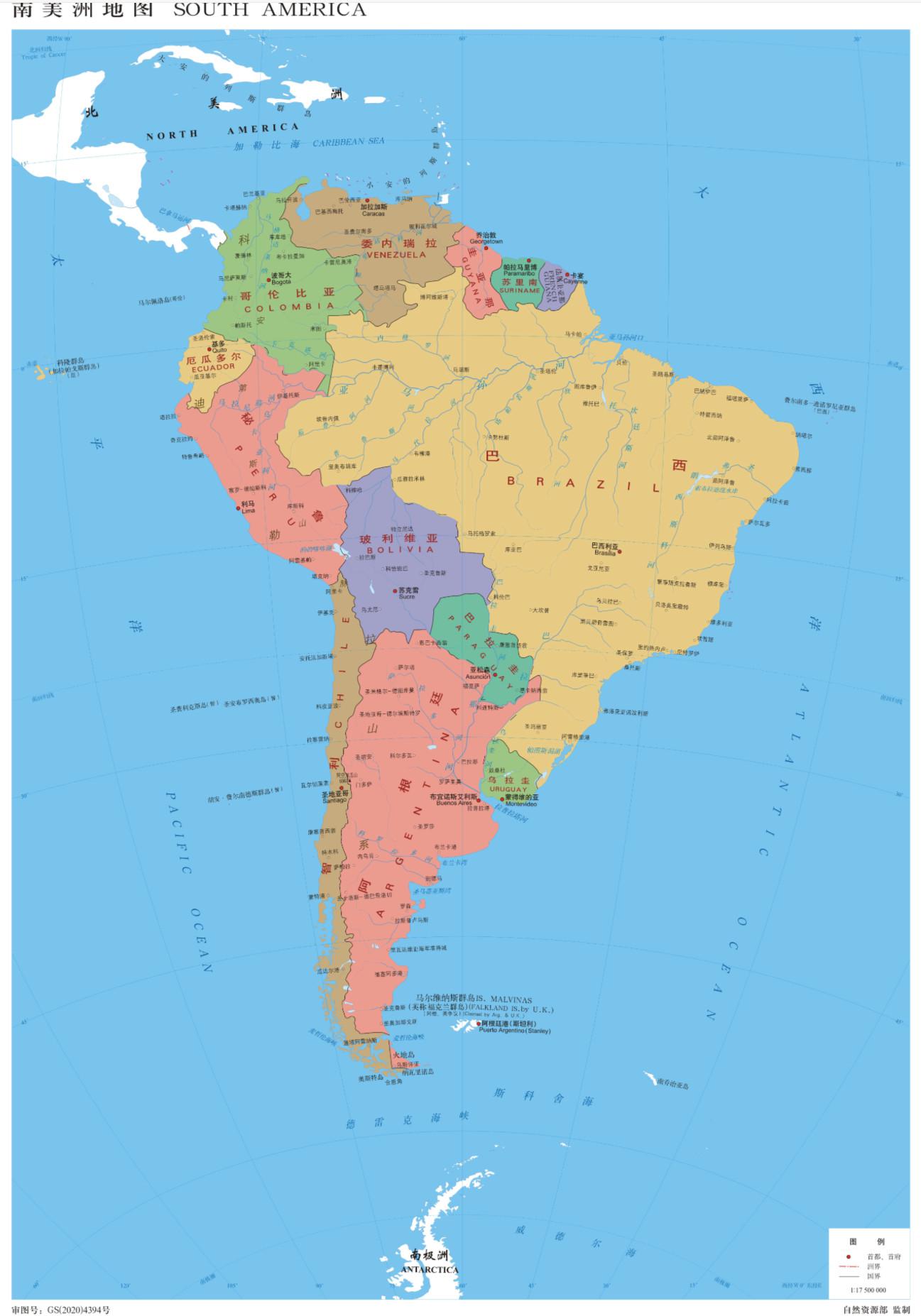 南美洲地图 1:1750万 4开 分国设色