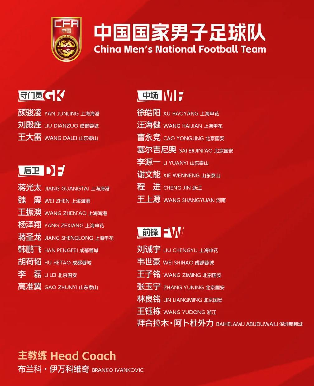 2025世预赛亚洲区 3月世预赛中国名单一览