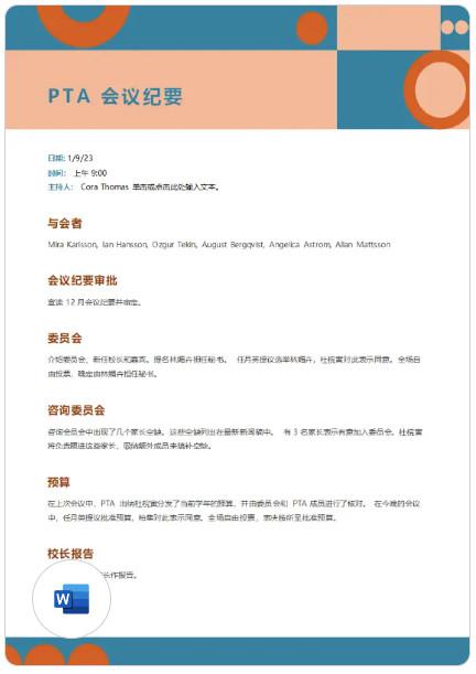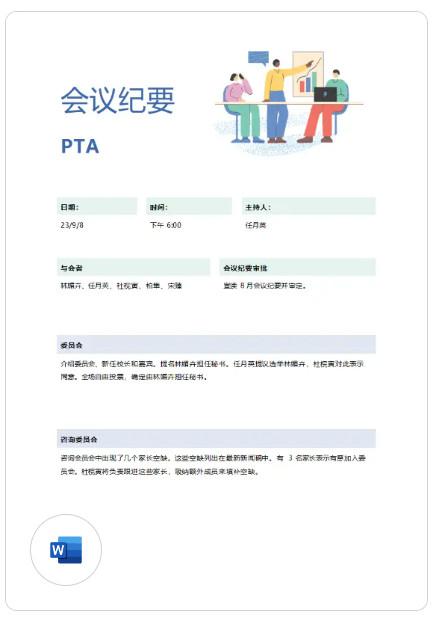 6、这款 PTA 会议纪要模板上有上次会议纪要审批、官员选举、委员会报告、预算、校长报告、新业务、通知等信息,让你能够轻松记录 PTA 会议纪要。