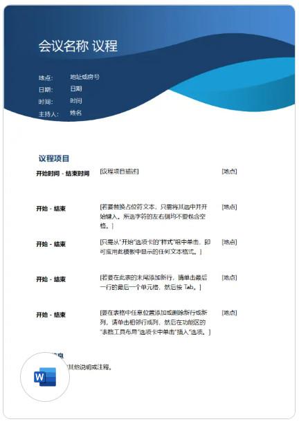 3、使用此简洁议程表向会议参与者传达信息,此会议纪要模板使用新式蓝色曲线设计