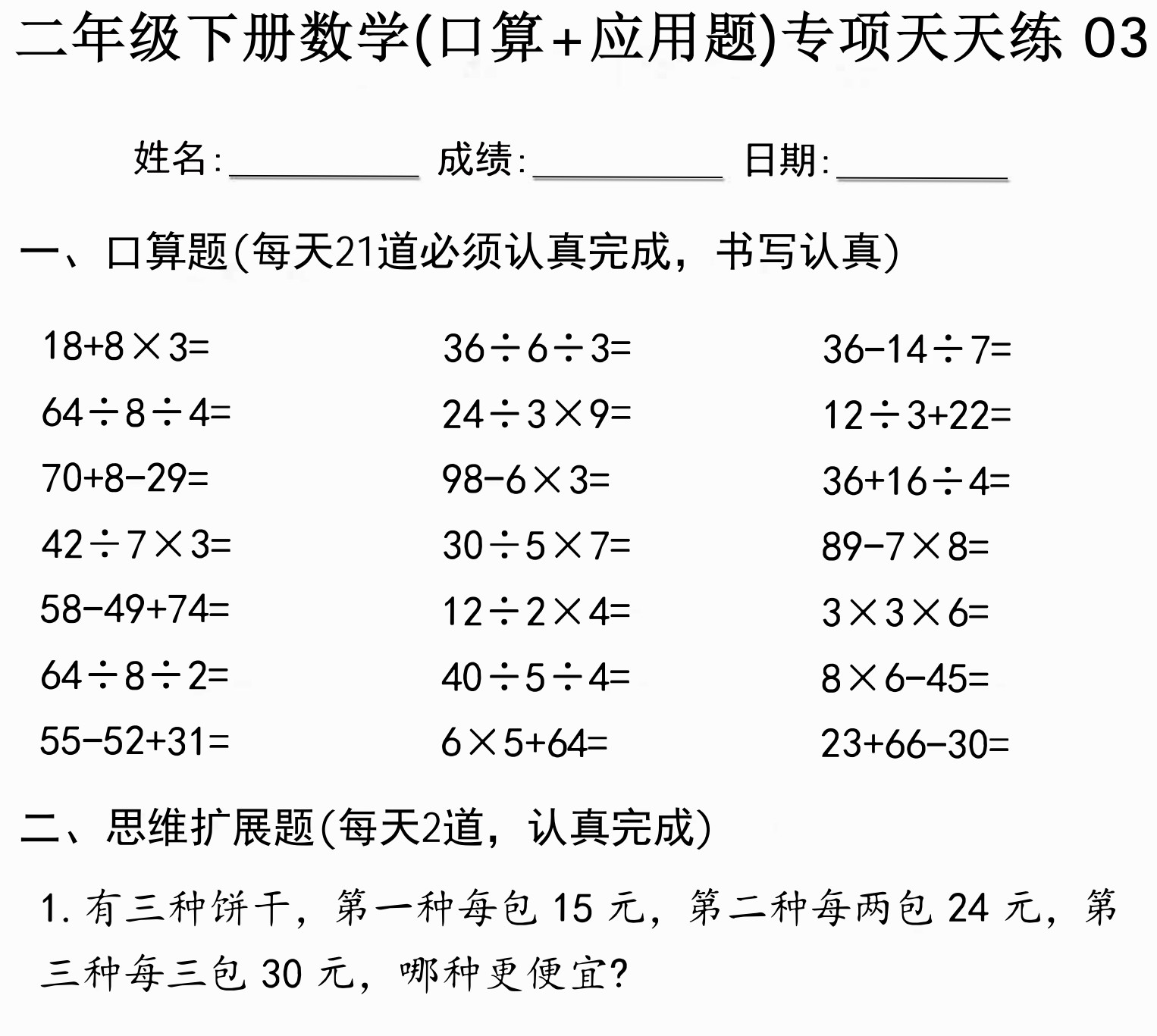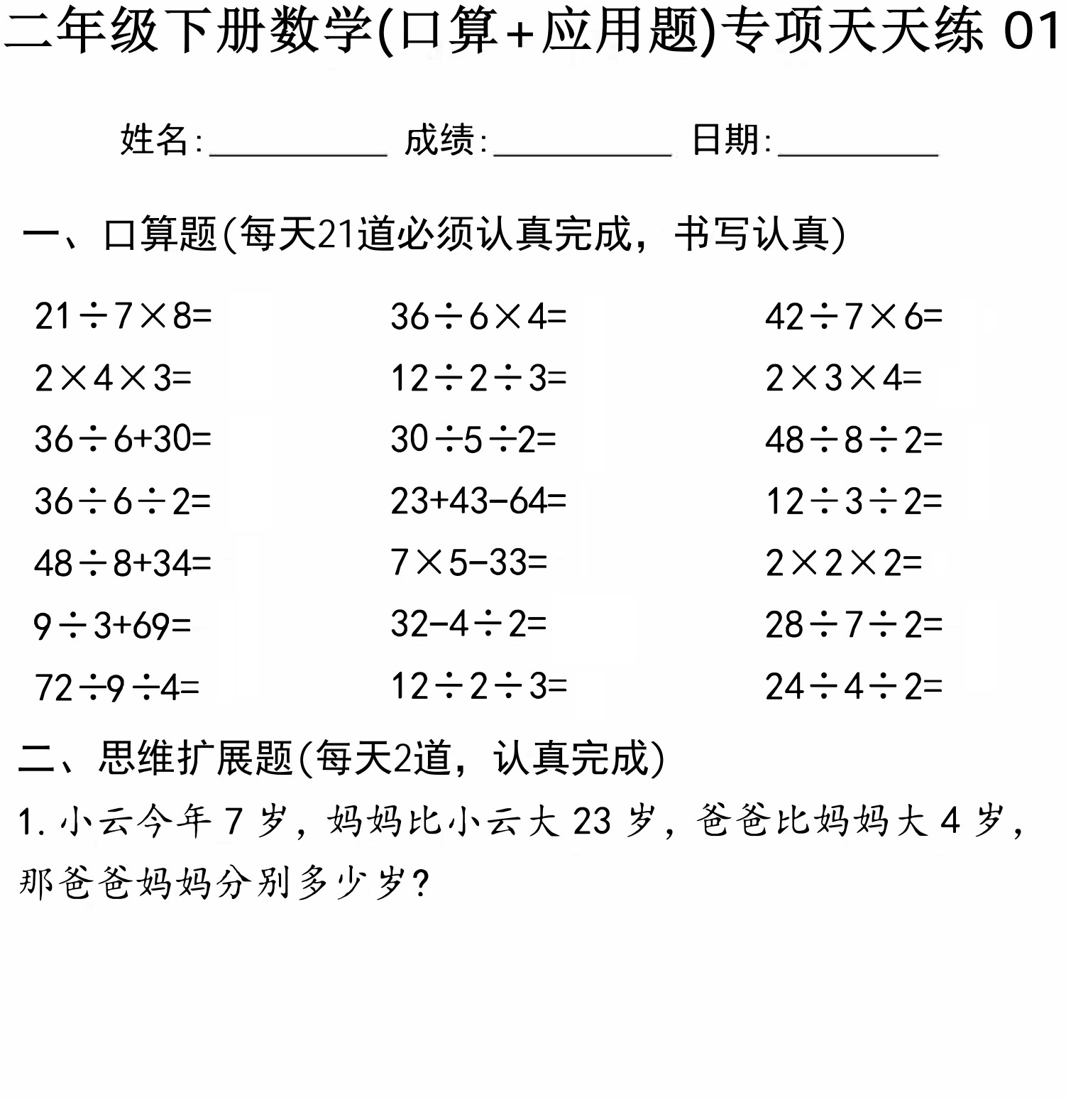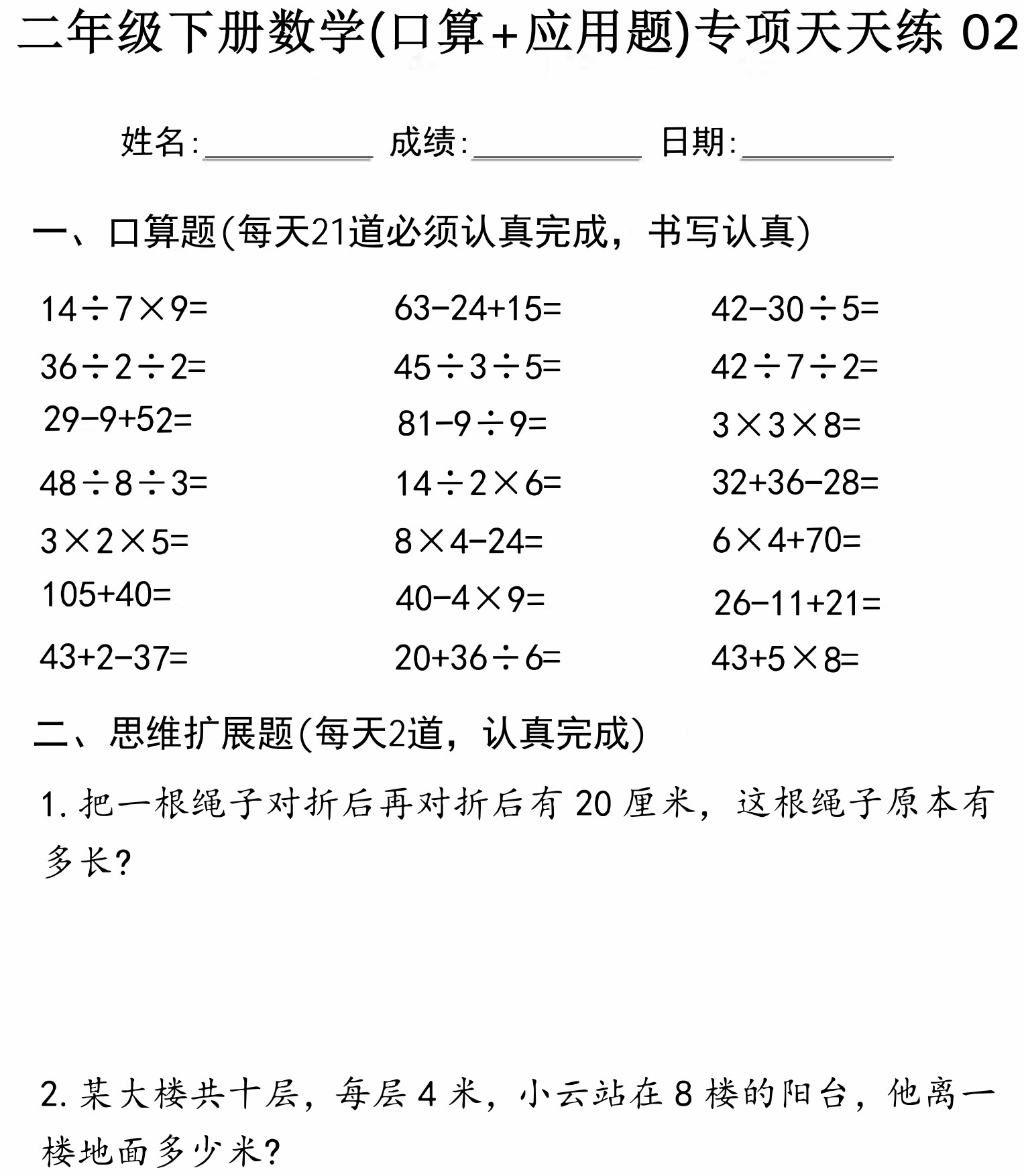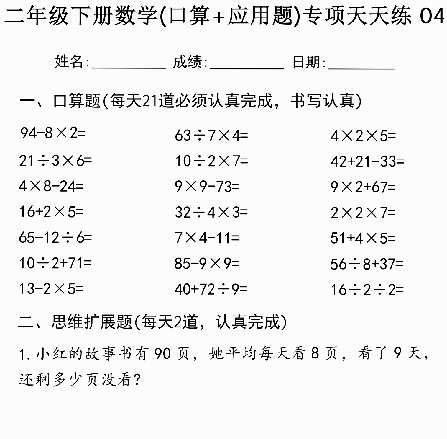 二年级下册数学口算题、应用题天天练 PDF可打印