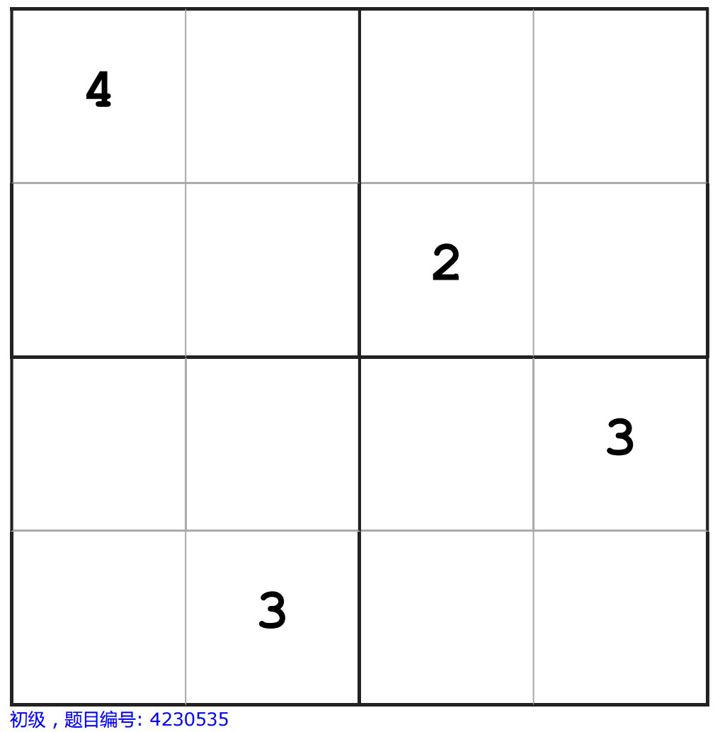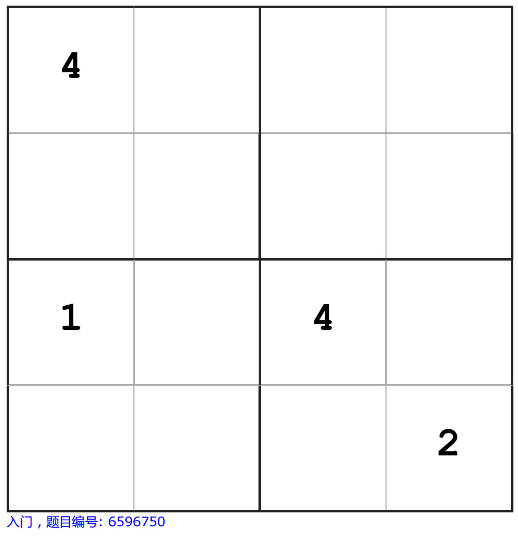 四宫数独的解题过程就是在4×4的方格内填入1-4的数字,要求每行每列和每组(粗线方框内的2×2的格子)的数字不能重复。